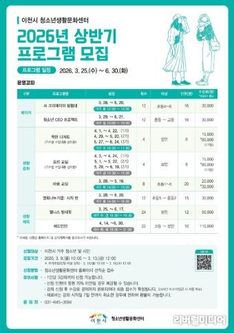 [리버럴미디어=공소리 기자] 이천시 청소년생활문화센터가 청소년과 지역주민의 건강한 생활문화 형성과 역량 강화를 위해 ‘2026년 상반기 프로그램’을 운영하고 수강생을 모집한다고 밝혔다.