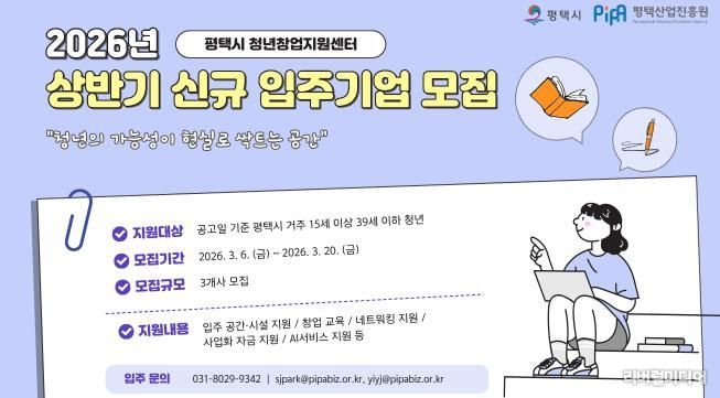 신청 대상은 15세 이상 39세 이하의 관내 청년 예비창업자 및 창업자다. 세부 지원 내용과 신청 방법은 평택시 누리집과 평택산업진흥원 누리집에서 확인하면 된다.