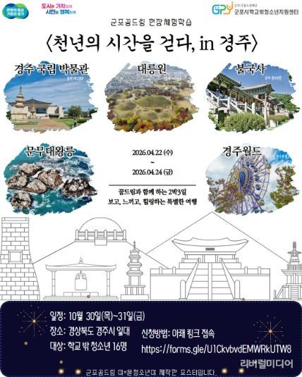 [리버럴미디어=공소리 기자] (재)군포시청소년재단(대표이사 김덕희) 군포시학교밖청소년지원센터(센터장 강연미)는 학교 밖 청소년 16명을 대상으로 오는 4월 22일부터 24일까지 2박 3일간 경상북도 경주시 일대에서 ‘역사캠프 현장체험학습 프로그램’을 운영한다고 밝혔다. 참가신청은 구글폼 등을 통해 접수 받은 뒤 신청 내용을 바탕으로 참여 대상자를 선정할 예정이다.