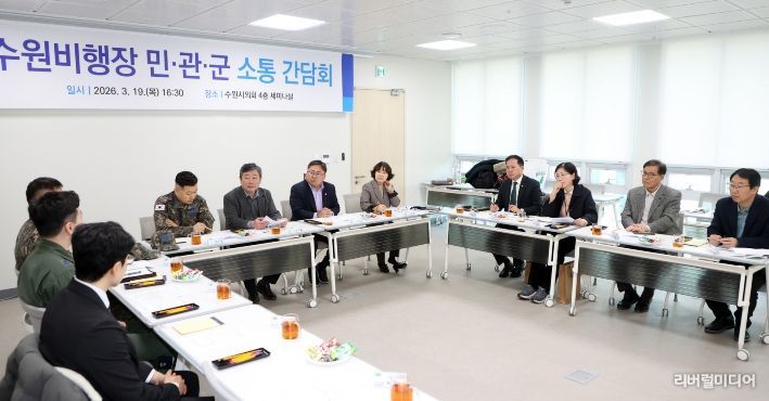 [리버럴미디어=공소리 기자] 수원특례시의회는 19일 의회 세미나실에서 공항 소음피해지역 주민들과 군, 시 관계자가 함께하는 ‘민·관·군 소통 간담회’를 개최하고 소음피해 해소를 위한 실질적인 대응 방안 마련에 나섰다.