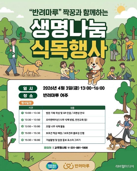 ‘반려마루 짝꿍’ 행사에는 반려마루 펫리더스 봉사단원 등 20여 명이 참여해 놀이터 주변에서 식목 행사를 진행한다. 이후에는 짝꿍 동물들과 함께 반려마루 산책로, 잔디마당, 스포츠 운동장에서 플로깅 활동과 교감 활동이 이어지며, 짝꿍이 된 보호동물 홍보 포스터 그리기도 진행된다. 완성된 포스터는 경기도 동물보호복지 플랫폼, 반려마루 여주 누리집, 반려마루 여주 인스타그램을 통해 게시될 예정이다.