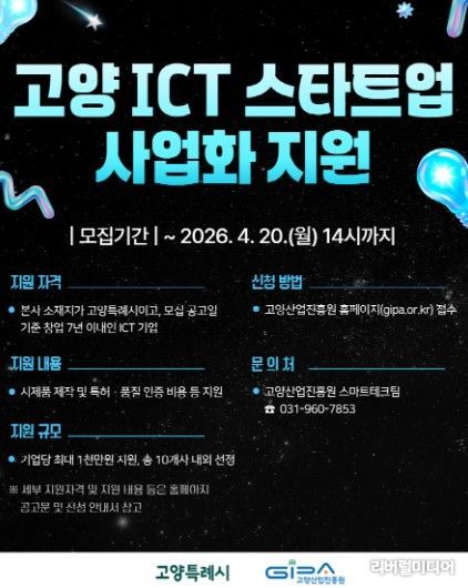 [리버럴미디어=공소리 기자] 고양산업진흥원이 ‘2026년 고양 ICT 스타트업 사업화 지원사업’ 참여 기업을 모집한다.