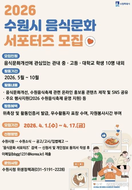 [리버럴미디어=공소리 기자] 수원특례시는 ‘2026년 음식문화 서포터즈’로 활동할 중·고등·대학생을 4월 17일까지 모집한다.