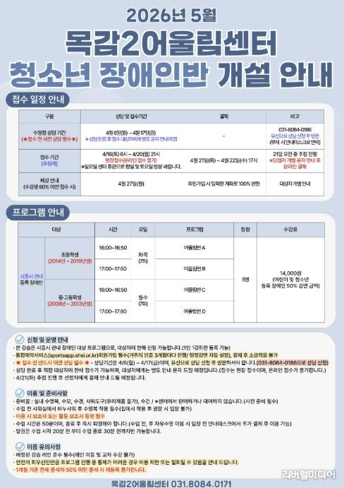 프로그램 접수는 4월 18일 6시부터 4월 20일 21시까지 현장 접수를 진행하고, 4월 21일 당첨자에게 개별 안내할 예정이다. 궁금한 사항은 목감2어울림센터로 문의하면 된다.