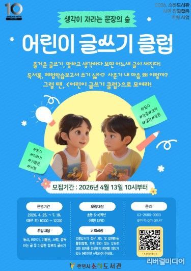 [리버럴미디어=공소리 기자] 광명시 소하도서관은 어린이 글쓰기 클럽 ‘생각이 자라는 문장의 숲’ 수강생을 오는 13일부터 모집한다.
