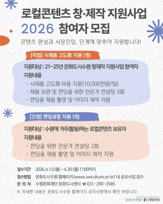 수원문화재단 관계자는 “이번 로컬콘텐츠 창·제작 지원사업은 수원만의 로컬콘텐츠가 실제 시장에서 경쟁력을 갖출 수 있도록 지원하는데 목적이 있다”며, “수원의 문화적 가치를 활용한 콘텐츠 개발에 수원 로컬 크리에이터의 많은 참여를 바란다”고 밝혔다.