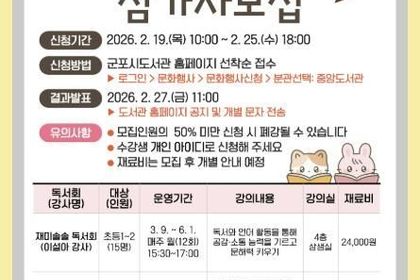 [리버럴미디어=공소리 기자] 군포시 중앙도서관은 독서를 통해 생각하고 함께 소통하며 올바른 독서습관 형성과 문해력을 키우는 아동 및 청소년 대상 독서회를 오는 3월 9일부터 6월 13일까지 운영한다. 독서회는 학년별로 운영되며, 초등 1~2학년 대상 ‘재미솔솔 독서회’, 초등 3~4학년 대상 ‘질문하는 독서회’, 초등 5~6학년 대상 ‘책별숲 독서회’, 중학생 대상 ‘청소년 독서회’로 구성된다. 특히, ‘청소년 독서회’는 토요일 오전에 진행되어 평일 학업으로 방문이 어려운 청소년들에게 참여 기회를 마련한다. 모든 독서회는 학년별 수준에 맞춰 12주 동안 우수한 독서지도 강사의 강의식 운영으로 이어져, 깊이 있는 독서 경험을 선사한다. 독서회에서는 각 연령대에 맞는 다양한 주제의 책을 읽고, 토론, 글쓰기, 만들기 등 다양한 독후활동을 통해 아동과 청소년의 문해력 향상 및 올바른 독서 습관 형성에 도움을 줄 예정이다. 독서회별 참여 인원은 선착순 15명으로, 2026년 2월 19일 10시부터 군포시도서관 누리집을 통해 신청할 수 있다.