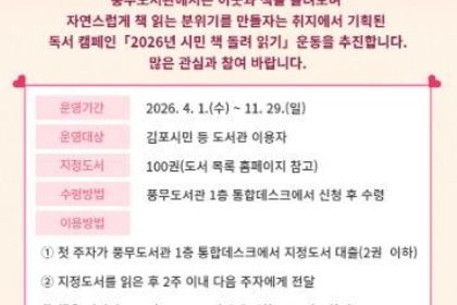 [리버럴미디어=공소리 기자] 김포시 풍무도서관은 오는 4월부터 ‘2026년 시민 책 돌려 읽기’ 독서 릴레이를 운영한다. 이웃과 책을 돌려 읽으며 자연스럽게 책 읽는 도시 문화를 만들자는 취지로 기획된 이 사업은 2007년부터 시작되어 현재까지 매년 운영되고 있다. 올해 ‘시민 책 돌려 읽기 지정 도서’는 총 100권으로 국내외 수상 도서를 비롯해 국립중앙도서관 등 관계 기관 추천 도서, 서점 베스트셀러, 신간 도서 가운데 선정됐다. 4월 1일부터 풍무도서관 1층 통합데스크로 방문해 1인당 최대 2권까지 대출할 수 있으며, 대출한 도서는 2주 이내에 읽은 후 이웃에게 전달하거나 풍무도서관으로 반납하면 된다.