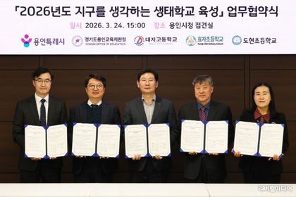 [리버럴미디어=공소리 기자] 용인특례시는 24일 시청 접견실에서 용인교육지원청을 비롯해 3개 학교와 ‘지구를 생각하는 생태학교 육성사업’을 위한 협약을 맺었다. 이날 협약식에는 조영민 교육장과 올해 생태학교로 선정된 대지고 유동철 교장, 효자초 정계환 교장, 도현초 연승희 교장, 담당 교사들이 참석했다. 이들 기관은 협약에 따라 ▲학교별 맞춤형 생태교육 운영 지원 ▲교과·교육과정과 연계한 생태교육 프로그램 개발·자문 ▲생태학교 육성사업 성과평가 등을 위해 협력하기로 했다. 올해 4년 차를 맞이한 ‘지구를 생각하는 생태학교’ 사업은 전국 지자체 중 최초로 환경교육 전문 인력을 학교 현장에 배치, 이론 교육을 넘어 실천 중심의 생태전환교육을 하는 용인시의 핵심 환경교육 사업이다. 시는 2023년부터 해마다 공모를 통해 지역 내 학교를 선정해 왔다. 올해 선정된 3개 학교를 포함해 총 12개교가 생태학교 사업에 참여하고 있다. 올해 기준 용인 지역은 초·중·고 343학급, 학생 9149명이 생태교육에 참여하면서 현장 중심의 체계적인 환경교육으로 높은 평가를 받고 있다. 시는 축적