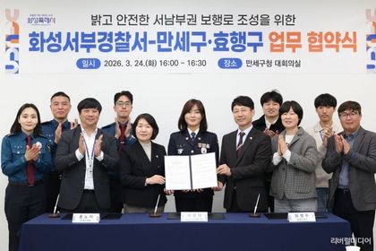 [리버럴미디어=공소리 기자] 화성특례시 만세구는 24일 만세구청 대회의실에서 화성서부경찰서, 효행구청과 함께 ‘밝고 안전한 서남부권 보행로 조성을 위한 업무협약(MOU)’을 체결했다고 밝혔다. 이번 협약은 어두운 보행로와 범죄 취약지역에 선제적으로 대응해 시민 불안을 줄이고 안전한 보행환경을 조성하기 위해 마련됐다. 협약에 따라 각 기관은 ▲보행로 조도 개선을 통한 범죄 사각지대 해소 ▲범죄예방 환경 조성을 위한 협력체계 구축 ▲야간 취약지역 합동 점검 및 개선사업 추진 등에 상호 협력할 계획이다. 특히 화성서부경찰서와 만세구청, 효행구청은 관내 범죄 취약지역에 대한 실태조사를 실시하고, 조도 개선이 필요한 구간을 발굴해 맞춤형 사업을 추진할 계획이다. 이를 통해 어두운 보행환경을 개선하고 시민이 안심하고 통행할 수 있는 안전한 도시 환경 조성에 기여할 것으로 기대된다. 홍노미 만세구청장은 “이번 협약을 통해 지역 내 보행환경을 보다 안전하게 개선하고, 시민이 체감할 수 있는 안전 정책을 지속적으로 추진하겠다”고 밝혔다. 최현아 화성서부경찰서장은 “지자체와의 협력을 통해 범