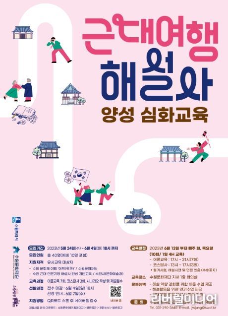 [리버럴미디어=공소리 기자] 수원문화재단은 문화체육관광부 공모사업으로 선정된 '계획공모형 지역관광개발사업'의 일환으로 진행하는 '근대여행 해설사 양성 심화 교육 과정' 교육생을 모집한다.