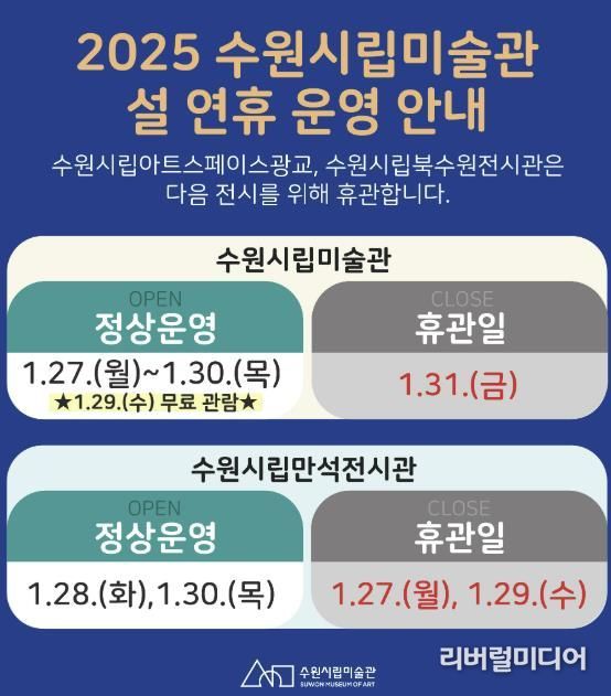 [리버럴미디어=공소리 기자] 경기도 수원시립미술관은 설 연휴 기간인 1월 27일부터 1월 30일까지 수원시립미술관을 정상 운영한다.