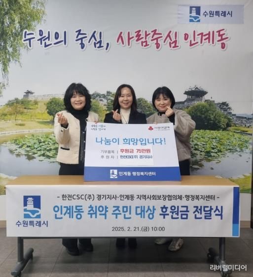 [리버럴미디어=공소리 기자] 지난 21일, 수원시 팔달구 인계동 행정복지센터 동장실에서 한전CSC(주) 경기지사 후원금 전달식이 진행됐다. 2024년 6월 20일 업무 협약을 토대로, 한전CSC(주) 경기지사는 작년 50만원에 이어, 올해 사내에서 자체적으로 바자회를 개최하고 모금한 75만원을 인계동에 기부했다.