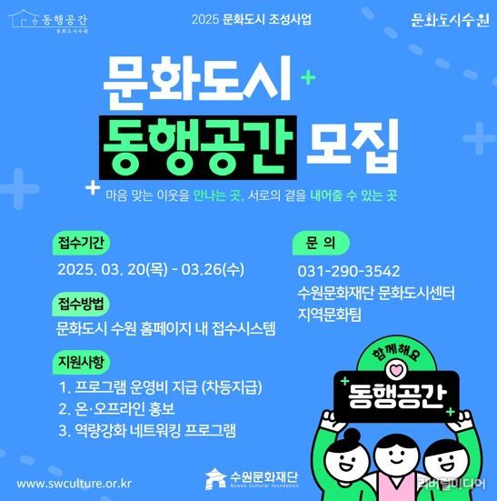 공모 접수 기간은 3월 20일부터 3월 26일까지이며, 수원시 내 공간운영자 중 해당 공간을 동행공간으로 활용할 의지가 있는 누구나 지원할 수 있다. 접수 및 자세한 내용은 문화도시수원 누리집에서 확인할 수 있다.