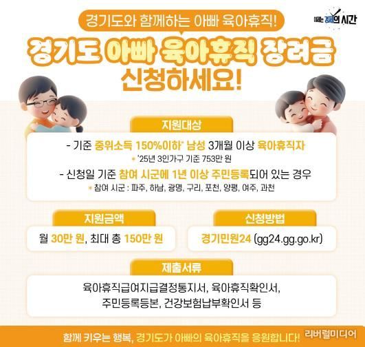 [리버럴미디어=공소리 기자] 경기도가 올해부터 ‘경기도 아빠 육아휴직 장려금 지원’ 사업을 하남, 광명, 양평, 여주, 파주, 구리, 포천, 과천 등 도내 8개 시군에서 시행한다.
