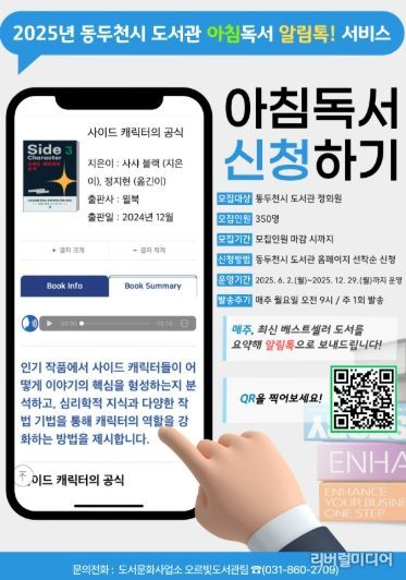 [리버럴미디어=공소리 기자] 동두천시 도서문화사업소 오르빛도서관은 도서관 회원을 대상으로 책 읽는 문화 조성을 위해 오는 6월부터 ‘아침독서 알림톡’ 서비스를 본격적으로 운영한다고 밝혔다.