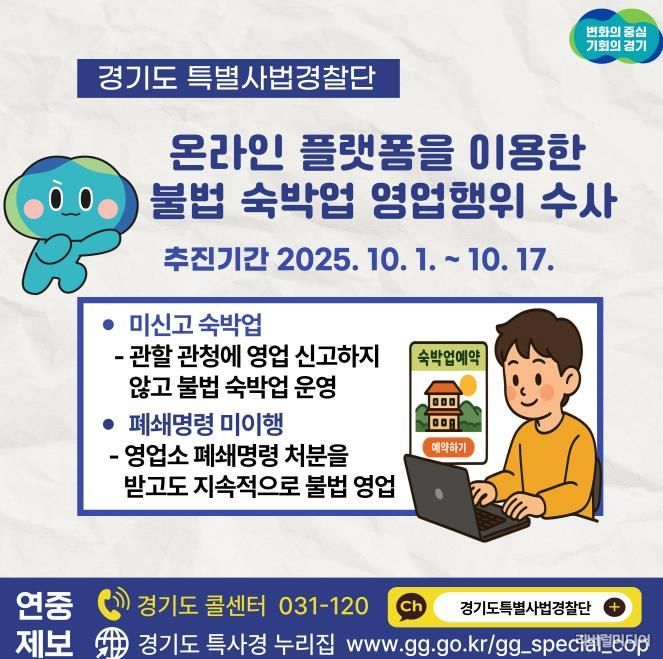 [리버럴미디어=공소리 기자] 경기도가 10월 1일부터 17일까지 3주간 온라인 공유 숙박 플랫폼을 이용해 오피스텔 등에서 불법 숙박업을 운영하는 미신고 업소를 집중 단속한다.