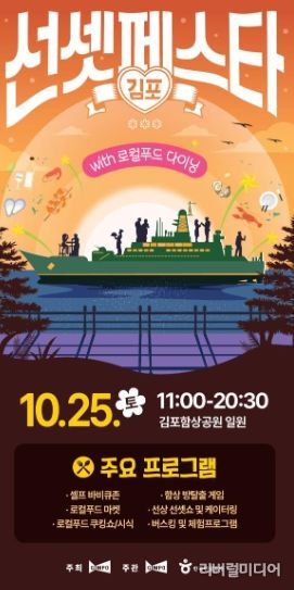 시 관계자는 “김포 선셋 페스타는 함상 석양을 배경으로 로컬푸드 미식과 문화 콘텐츠가 어우러지는 색다른 축제”라며 “안전하고 쾌적한 환경에서 시민과 관광객 모두에게 잊지 못할 경험을 제공하겠다”고 말했다.
