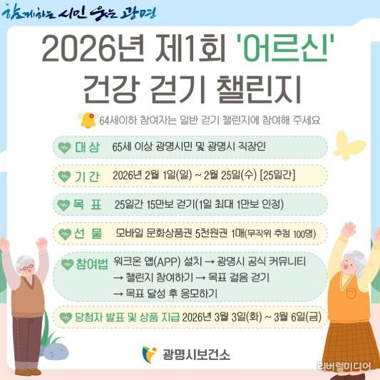 [리버럴미디어=공소리 기자] 광명시가 오는 2월부터 모바일 걷기 플랫폼 ‘워크온(WalkOn)’을 활용한 걷기 챌린지 방식을 개편하고, 65세 이상 시민을 위한 ‘어르신 걷기 챌린지’를 별도로 운영한다고 21일 밝혔다.