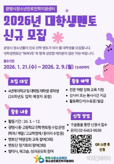 [리버럴미디어=공소리 기자] 광명시청소년재단 청소년진로진학지원센터는 관내 중·고등학교 청소년 대상 학과 멘토링 운영을 위해 ‘2026년 대학생 멘토단(wave)’을 모집한다고 밝혔다.