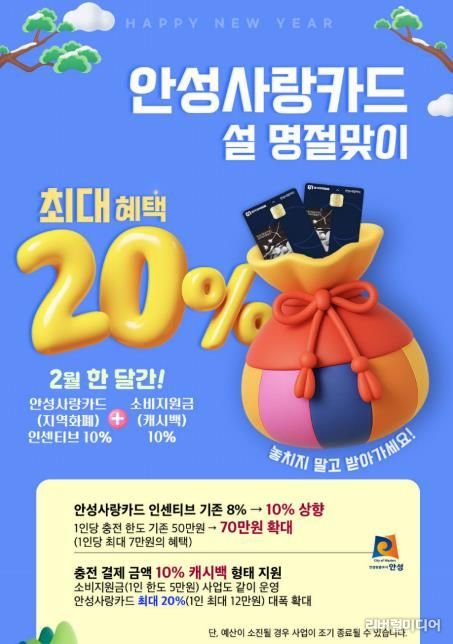 [리버럴미디어=공소리 기자] 안성시가 설 명절을 맞아 시민들의 장바구니 부담을 덜어주고, 위축된 골목상권에 활력을 불어넣기 위해 2월 한 달간 안성사랑카드 혜택을 최대 20%로 상향한다.