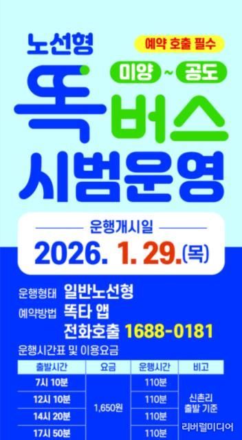 [리버럴미디어=공소리 기자] 안성시는 1월 29일부터 미양면과 공도읍을 직접 연결하는 노선형 똑버스를 운행한다.
