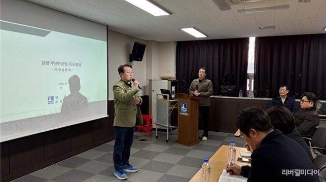 [리버럴미디어=공소리 기자] 수원특례시의회 오세철 의원(더불어민주당, 파장·송죽·조원2동)은 지난 28일 파장동 행정복지센터에서 열린 ‘일림어린이공원 리모델링 사업 주민설명회’에 참석해 주민들의 의견을 청취하고, 제기된 사항이 설계와 시공 과정에 반영될 수 있도록 담당 부서에 당부했다.