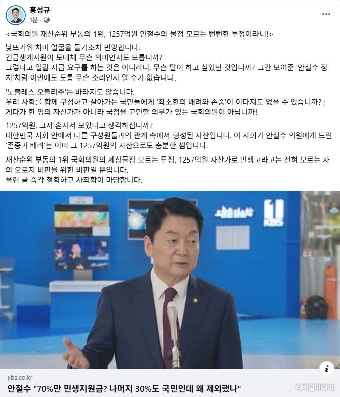 [리버럴미디어=공소리 기자] 홍성규 진보당 경기도지사 후보는 2일 SNS에 글을 올려 최근 안철수 의원의 '상위 30% 배려와 존중' 주장에 "긴급생계지원금이 무슨 의미인지는 아나! 재산순위 부동의 1위 국회의원의 세상물정 모르는 투정이자 민생고라고는 전혀 모르는 1257억원 자산가의 오로지 비판을 위한 비판"이라고 일갈했다.