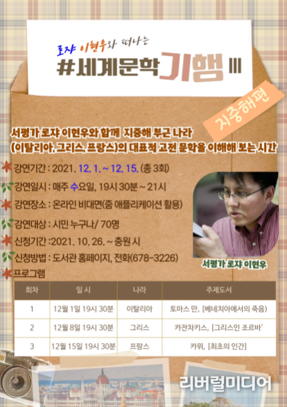 [리버럴미디어=공소리 기자] 안성시 공도도서관은 12월 1일부터 15일까지 3주간 매주 수요일 밤 7시 30분에 이현우 작가를 초청해 ‘로쟈 이현우와 떠나는 세계문학기행 지중해 편’ 강연회를 운영한다고 밝혔다. 이번 강연회는 코로나19 사태가 지속되는 상황을 고려하여 클라우드 미팅 지원 애플리케이션 줌(Zoom)을 활용한 비대면 온라인방식으로 진행한다.