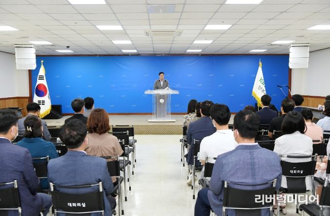 [리버럴미디어=공소리 기자] 강수현 양주시장이 1일 시청 대회의실에서 취임 이후 처음 열린 월례조회에 참석해 훈시를 하고 있다.