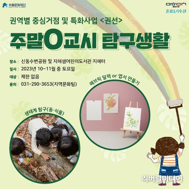 이번 프로그램은 문화도시 수원의 권역별 중심거점 사업의 일환으로, 23년 권선 및 영통 같이공간 지정을 기념하여 진행한다. 수원문화재단 관계자는 “자연 생태계를 탐구하면서 문화 체험을 즐기기를 원하는 시민들의 많은 참여 부탁드린다.”라고 전했다.