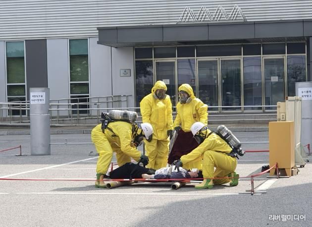 유해화학물질인 메틸 알코올 누출로 인한 화재 상황을 설정해 진행한 이 훈련은 자체 매뉴얼에 따라 ▲비상 상황 긴급전파 ▲소방대 초동 조치 ▲화재 진압 ▲인명구조 ▲사고 복구 등으로 구성됐다.