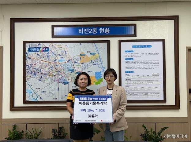 [리버럴미디어=공소리 기자] ㈜유화는 추석 명절을 맞아 지난 29일 비전2동 행정복지센터를 방문하여 100만원 상당의 백미 30포를 전달하며 온정을 베풀었다.