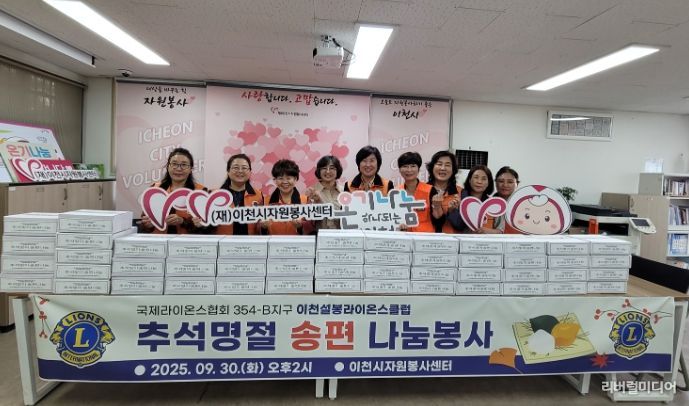 [리버럴미디어=공소리 기자] 이천시 자원봉사센터는 지난 9월 30일 이천설봉라이온스클럽과 함께 사랑의 송편 나눔 행사를 개최하며 ‘2025년 추석맞이 집중 자원봉사 주간’에 동참했다.
