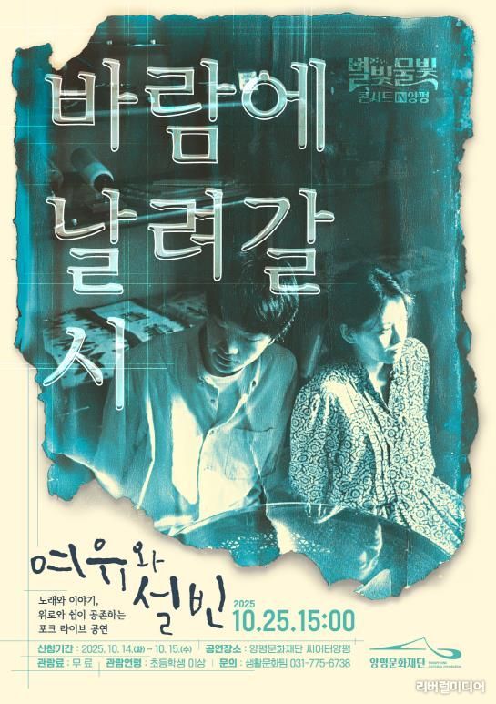 [리버럴미디어=공소리 기자] 양평문화재단은 오는 10월 25일 오후 3시, 양평문화재단 2층 씨어터양평에서 ‘별빛물빛 콘서트 in 양평’ 10월 정기 공연으로 인디 듀오 여유와 설빈의 '바람에 날려갈 시'를 선보인다.