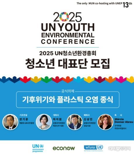 [리버럴미디어=공소리 기자] 성남시청소년청년재단 판교유스센터와 환경단체 에코나우는 오는 11월 15일부터 16일까지 이틀간 성남 국립국제교육원에서 열리는 ‘2025 UN청소년환경총회’에 참가할 국내외 청소년 대표단 300명을 10월 13일까지 모집한다. 이번 총회는 성남시청소년청년재단 판교유스센터와 환경단체 에코나우가 공동 주관하며, 반기문 전 UN사무총장과 브라질 대사 등 주요 인사가 참석한다.