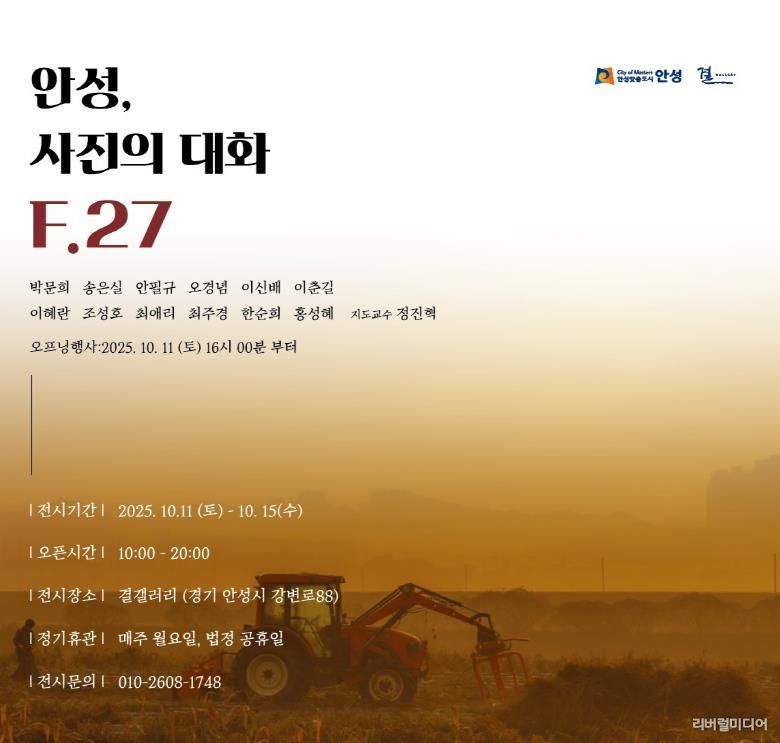 [리버럴미디어=공소리 기자] 안성시 사진동아리 F.27 photo가 오는 10월 11일부터 15일까지 안성천 작은미술관 결갤러리에서 전시회 ‘안성, 사진의 대화 F.27’을 개최한다. 이번 전시는 동아리 회원 18명이 참여해 안성의 자연환경과 사람들의 이야기를 기록한 작품을 선보인다.