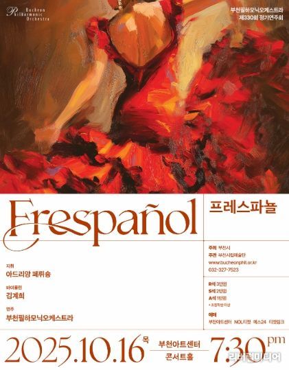 [리버럴미디어=공소리 기자] 부천필하모닉오케스트라가 오는 10월 16일 오후 7시 30분 부천아트센터 콘서트홀에서 제330회 정기연주회 '프레스파뇰'를 개최한다. 이번 무대는 프랑스와 북유럽을 대표하는 명곡들을 중심으로, 스페인의 정열과 낭만이 교차하는 다채로운 프로그램으로 꾸며진다. 공연에는 상임지휘자 아드리앙 페뤼숑과 부천필이 무대에 오르며, 협연자로는 제17회 차이콥스키 국제 콩쿠르 기악 부문 한국인 최초 우승자 바이올리니스트 김계희가 함께한다.