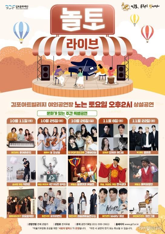 [리버럴미디어=공소리 기자] (재)김포문화재단은 10월 11일부터 11월 22일까지 매월 둘째, 넷째 주 토요일마다 김포아트빌리지 야외공연장에서 하반기 토요상설공연 '놀토 라이브'를 개최한다고 밝혔다.