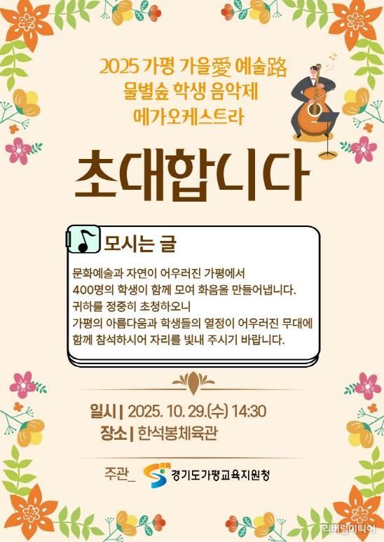 [리버럴미디어=공소리 기자] 경기도가평교육지원청이 주관하는 ‘2025 가평 가을愛 예술路 물별숲 학생 음악제 메가오케스트라’가 10월 29일 오후 2시 30분, 가평군 한석봉체육관에서 열린다.