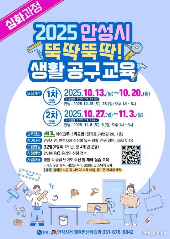 [리버럴미디어=공소리 기자] 안성시는 시민들의 생활 자립 역량 강화를 위해 '뚝딱뚝딱 생활 공구[심화과정] 교육'을 오는 10월 25~26일과 11월 8~9일, 총 2회 주말 일정으로 운영한다고 밝혔다.
