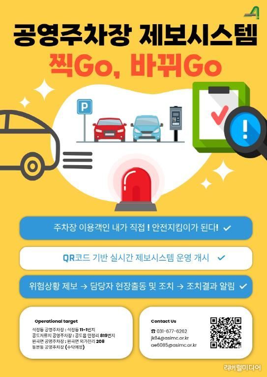 [리버럴미디어=공소리 기자] 안성시시설관리공단은 10월 10일부터 원곡면, 석정동, 공도 저류지, 동본동(수탁예정)공영주차장 4개소 대상으로, 이용객이 직접 주차장의 위험요소나 이용 불편사항을 손쉽게 제보하고 개선에 참여할 수 있는 QR 코드 기반의 실시간 위험상황 제보시스템 “찍Go, 바뀌Go”를 운영한다고 밝혔다.