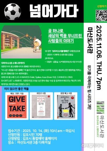 [리버럴미디어=공소리 기자] 마산도서관은 오는 11월 6일 19시, 본관 3층 다목적실에서 ‘공 하나로 세상의 벽을 무너뜨린 사람들의 이야기’ 프로그램을 운영한다고 밝혔다.