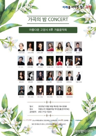 [리버럴미디어=공소리 기자] 고양특례시가 후원하고, (사)한국예술문화단체총연합회 고양지회가 주최하며 (사)한국음악협회 고양지부가 주관하는 ‘2025 가곡의 밤 – 아름다운 고양시 8경(景) 가을 음악회’가 오는 16일 오후 7시 30분, 고양아람누리 아람음악당에서 개최된다.
