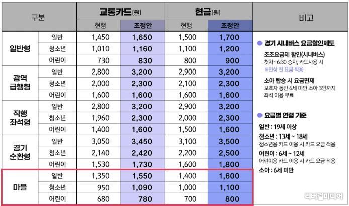 그 결과 교통카드 기준 △일반 시내버스 요금은 성인 1450원→1650원, 청소년 1010원→1160원, 어린이 730원→830원 △직행좌석형과 광역급행형(M) 버스는 성인 2800원→3200원, 청소년 1960원→2300원, 어린이 1400원→1600원 △경기순환형 버스는 성인 3050원→3450원, 청소년 2140원→2420원, 어린이 1530원→1730원 △마을버스 요금은 성인 1350원→1550원, 청소년 950원→1090원, 어린이 680원→780원으로 각각 인상된다.