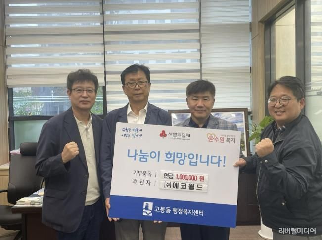 [리버럴미디어=공소리 기자] 수원시 팔달구 고등동은 10월 13일, 사회적기업 ㈜에코월드로부터 관내 취약계층을 위한 이웃돕기 성금 100만원을 전달받았다고 밝혔다.