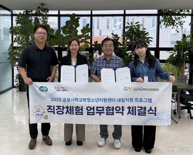 [리버럴미디어=공소리 기자] 군포시청소년재단(대표이사 김덕희), 군포시학교밖청소년지원센터(센터장 강연미)는 시각디자인 분야로의 진학과 진로를 희망하는 학교 밖 청소년을 지원하기 위해 관내 디자인 전문업체인 ㈜은진과 직장체험 업무협약을 체결했다고 밝혔다.