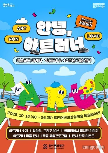 [리버럴미디어=공소리 기자] (재)용인문화재단은 예술교육 매개자 ‘아트러너(Art Runner)’ 사업 10주년을 맞아 오는 10월 15일부터 26일까지 용인어린이상상의숲 예술놀이터에서 기념 전시 '안녕, 아트러너'를 개최한다.