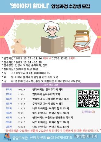 도서관 관계자는 “지역 어르신들이 삶의 지혜와 전통 이야기를 전하며 세대 간 소통의 다리를 놓는 뜻깊은 과정이 될 것이고 본 과정을 수료한 참여자들은 2026년 ‘책 읽어주기’ 자원봉사 프로그램에 참여할 수 있도록 안내할 계획이다.”라고 전했다.