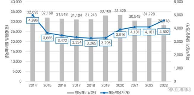 2023년 기준 경기도 영농폐기물 발생량은 영농 폐비닐이 약 3만 톤(93%), 폐농약 용기가 약 460만 개(94%)로 나타났다.